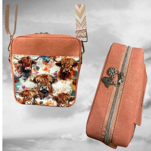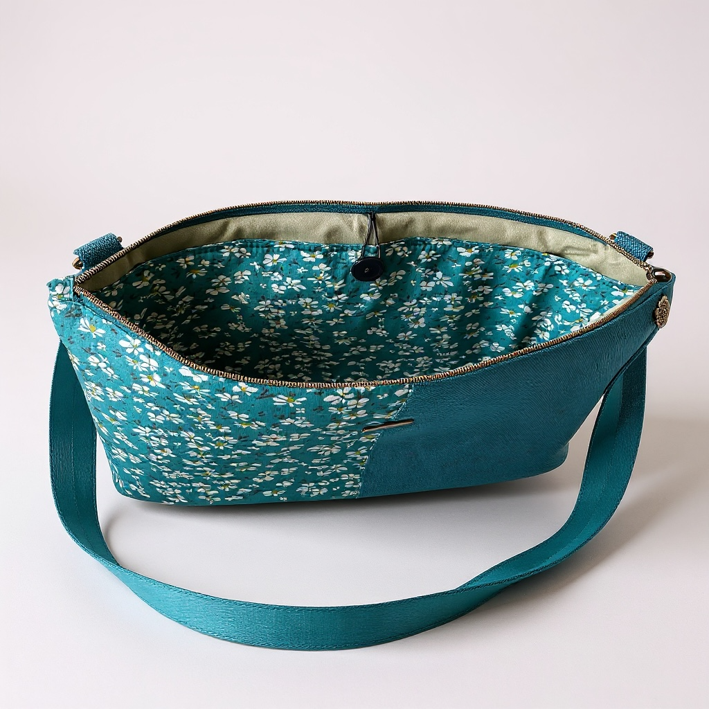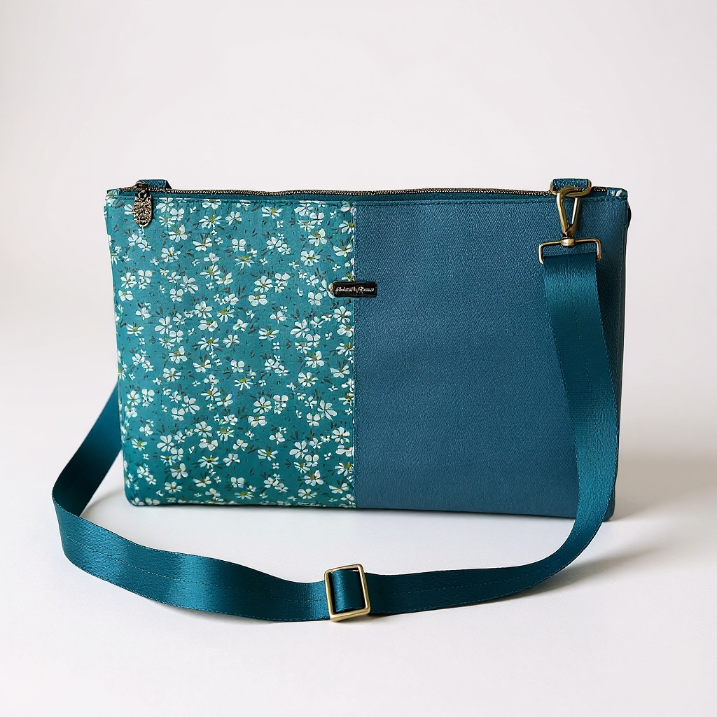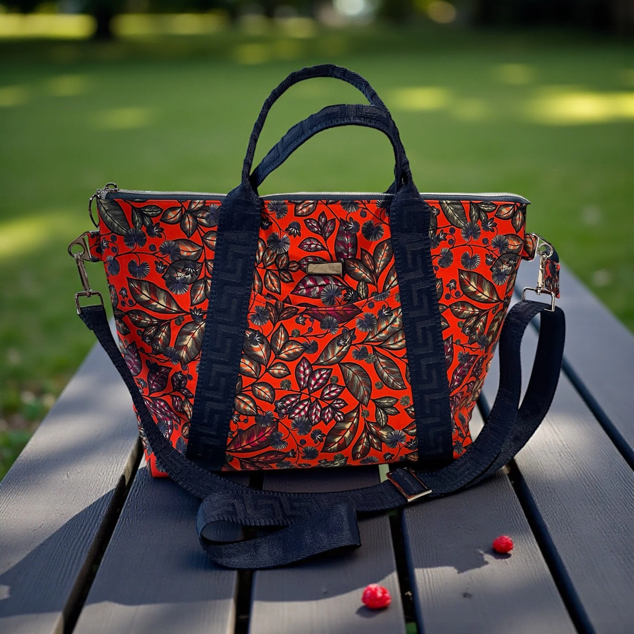 Zip top every day tote bag with cross body strap. Made with a tapestry style fabric.